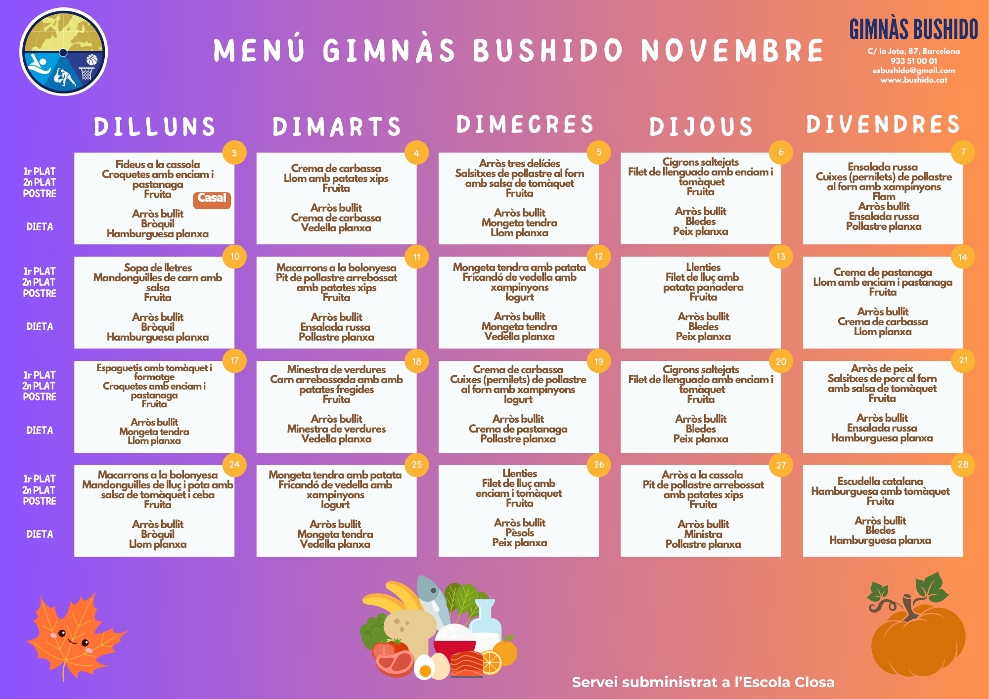 L'espai del migdia és un moment del dia que ha de proporcionar als infants i joves temps per menjar, per gaudir i descansar. Comptem amb cuina pròpia i és l'empresa de serveis Bushido qui proporciona els productes i el personal, i l'escola vetlla per la seva qualitat i execució.